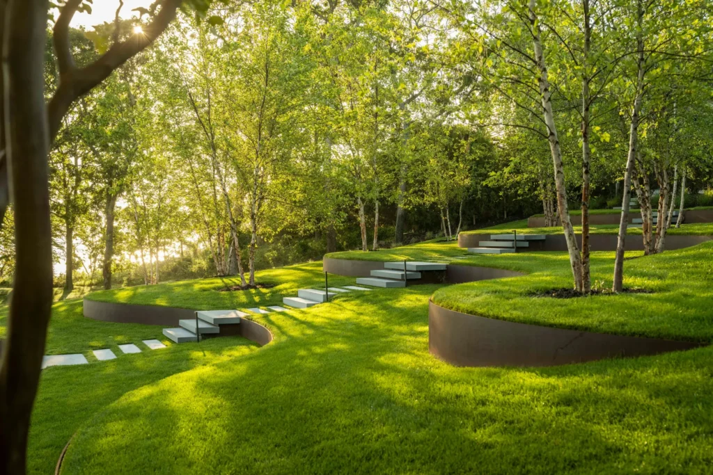 Retaining and seating walls, steps, and planters that manage grade changes, define spaces, and mirror the architecture of the home or building.