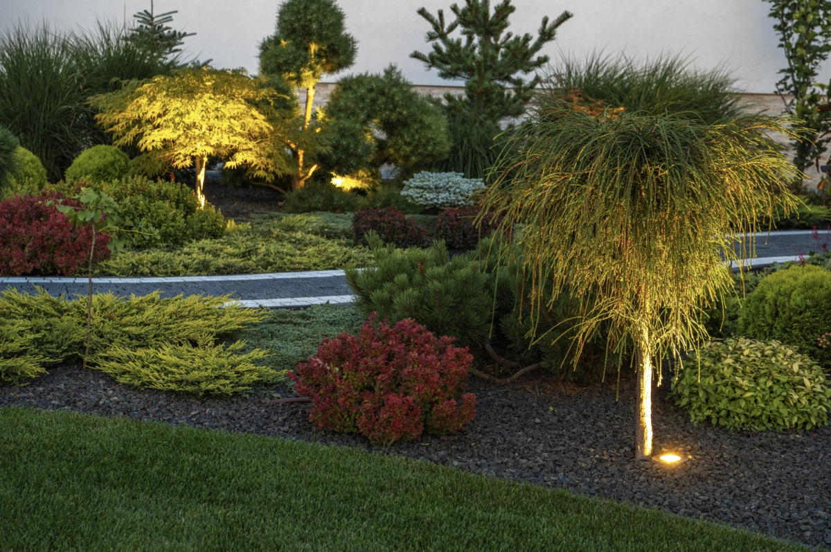 After-dark views where path lights, uplights, and accent fixtures make the property feel safe and dramatic.